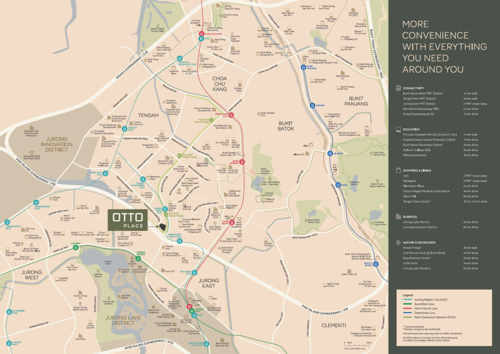 Future Tengah Park and Bukit Batok West MRT stations on the Jurong Region Line are just a short stroll from Otto Place EC. The Estate has easy access to the Pan-Island Expressway (PIE), Kranji Expressway (KJE), and Bukit Timah Expressway (BKE), making it most convenient to get to Singapore’s main attractions and Central Business District.